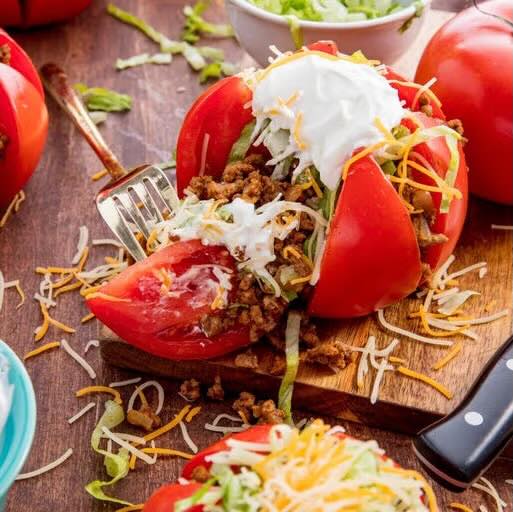 Divide taco meat among tomatoes, then top each with cheese, lettuce, and sour cream before serving.